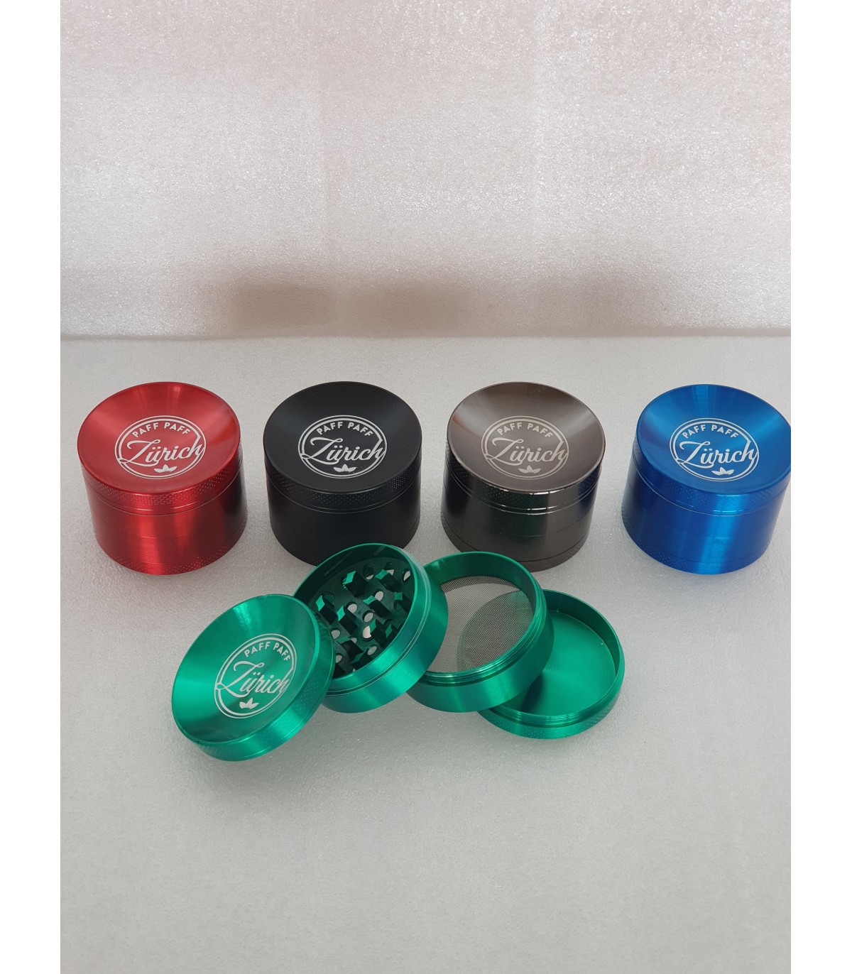 Paff Paff Zürich Grinder, in 6 different colors, The Paff Paff Zürich Grinder has a mold on top of the grinder to use as a tray or an ashtray.